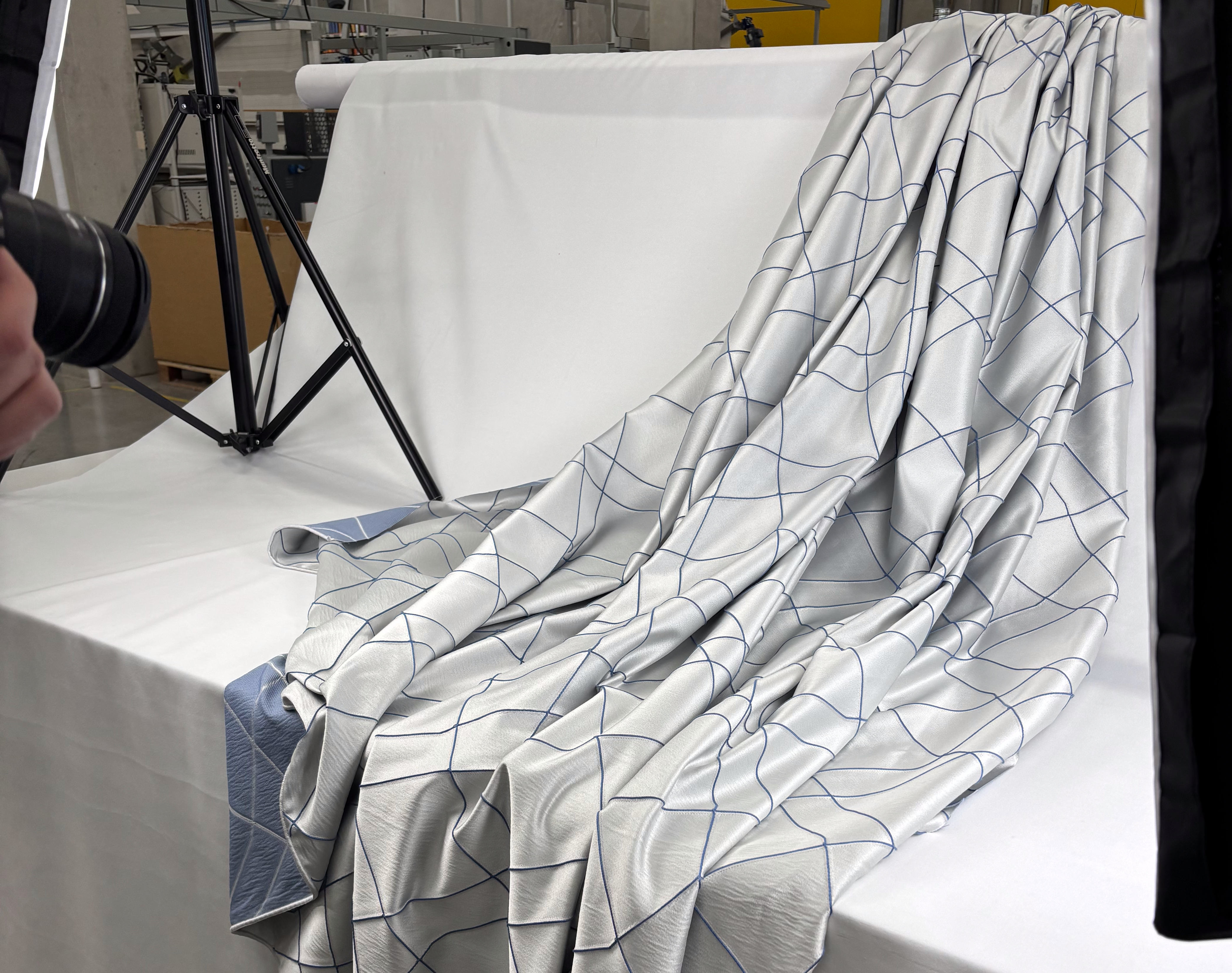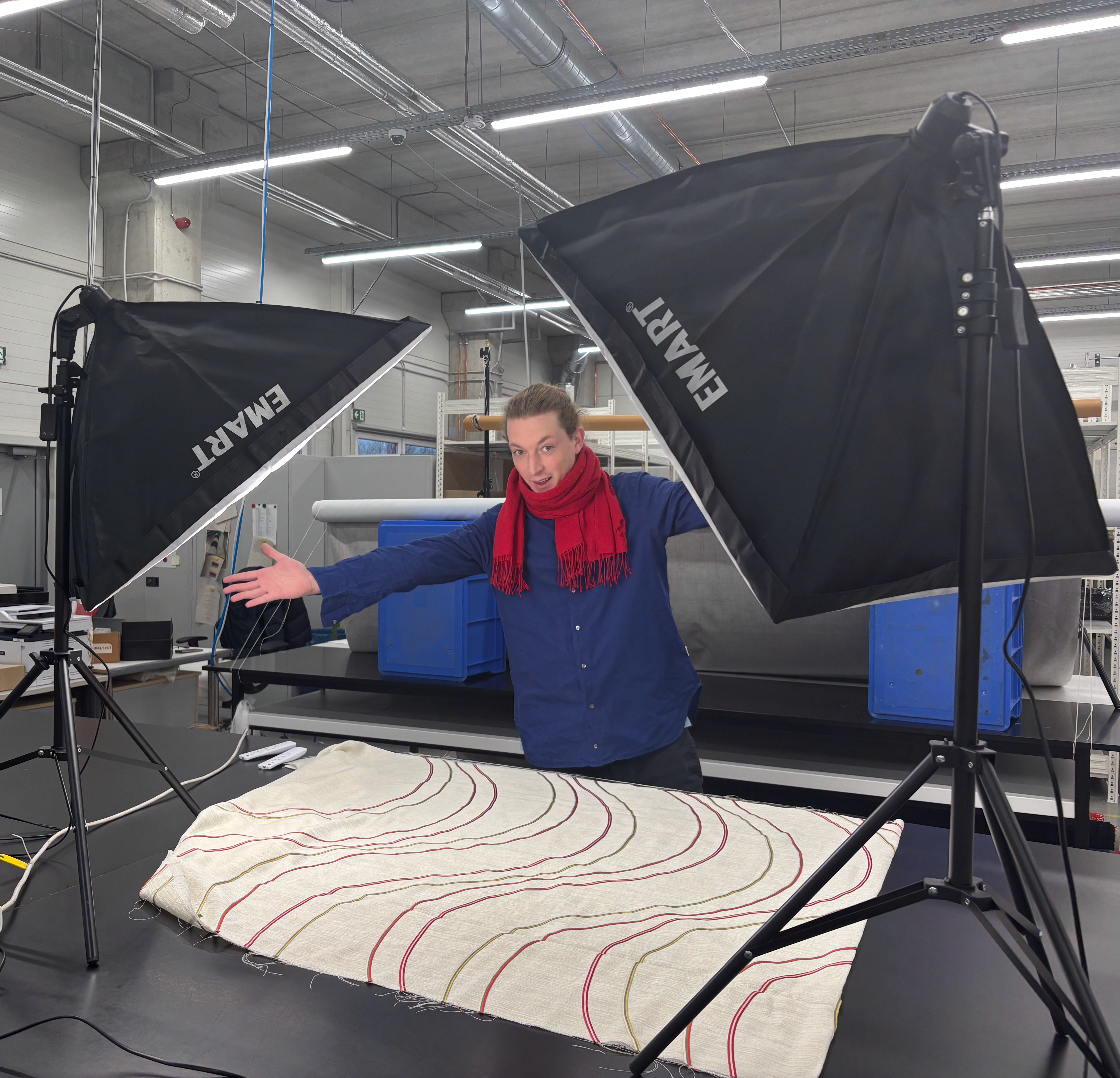 Once we’re at the warehouse, we finally get to touch the fabrics in person — that’s our “wow” moment! This is when the true diversity reveals itself: unique surfaces, patterns, techniques — we learn something new every time and are always amazed by the variety of materials. Most of our team comes along, and we work in shifts since our shooting time is limited. Among machines, shelves, and rolls of fabric, we set up our small photo studio on a big table. With two lights, a camera, a white background, and a bit of time pressure (plus a lot of love for detail), we capture the product photos that you later see in our shop. These days are long and exhausting for all of us, so we always reward ourselves afterward with a cozy team dinner.